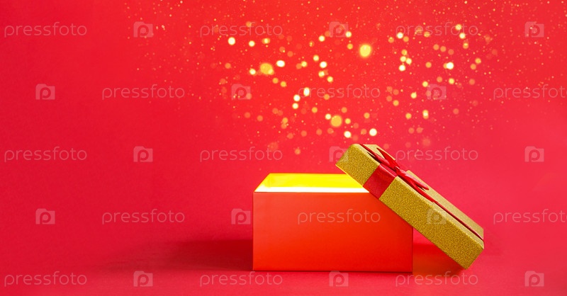 Открытая красная подарочная коробка с бантом с золотым сиянием и блеском внутри на красном фоне, баннер, копирайт. всеобщий праздник, рождество, день святого валентина, новый год, день рождения, юбилей, подарок
