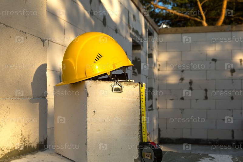 Строительная желтая каска, ключ и рулетка для дома на окне жилья из блоков пористого бетона. Строительство под ключ, будущий дом, проектирование, строительство. Безопасность труда. Копировать пространство