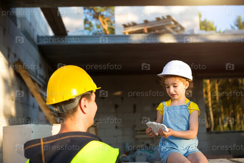 Папа и дочь на стройке своего будущего дома. Выбор будущей профессии строителя передается ребенку по наследству. Ожидание переезда, мечта о доме. Ипотечный заем
