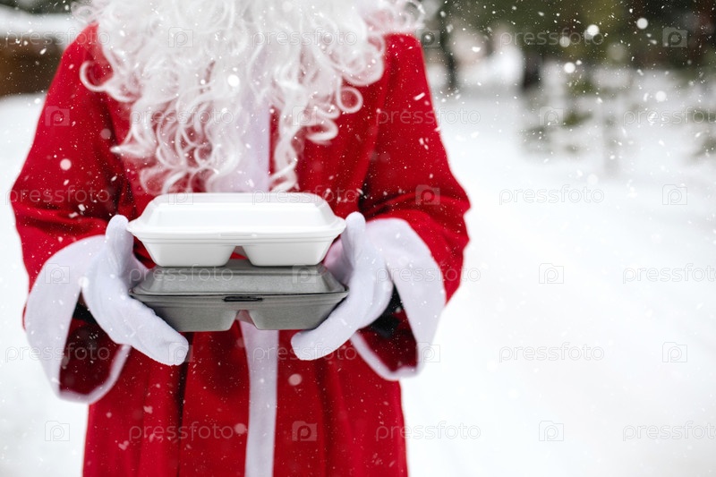 Контейнеры службы доставки еды в руках Санта-Клауса на открытом воздухе в снегу. Акция в канун Рождества. Готовый горячий заказ, одноразовая пластиковая коробка. Питание новогодних праздников. Скопируйте пространство, макет