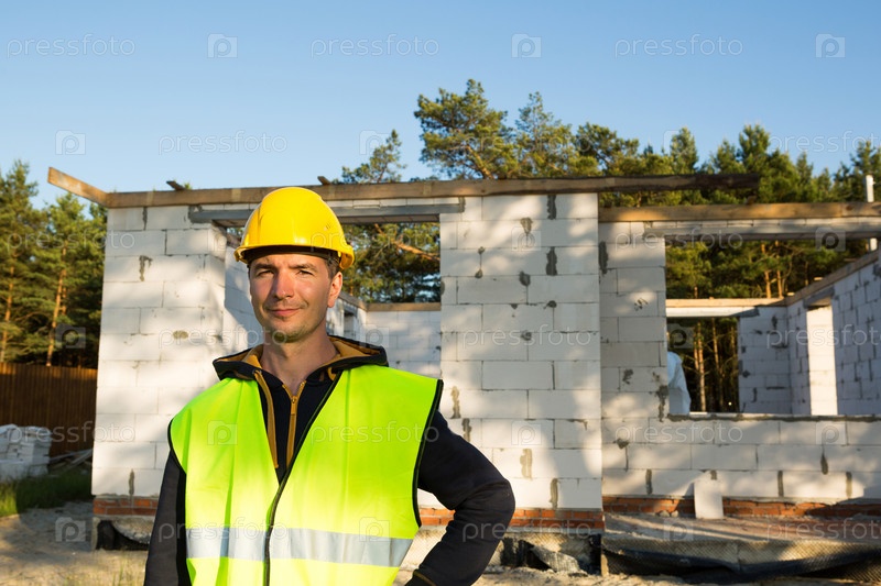Архитектор проекта стоит возле строительной площадки дома со стенами из пористого бетонного блока и кирпича. Строитель в защитной желтой каске и светоотражающем жилете