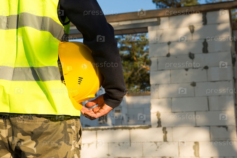 Строитель держит в руке желтую защитную каску на строительной площадке с фундаментом и стенами дома из ячеистых бетонных блоков и строительных материалов. Безопасность труда, макет