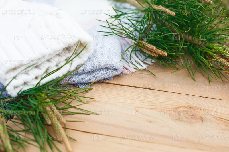 Рождественская квартира на деревенском деревянном фоне: зеленые сосновые иголки с шишками, теплые шерстяные вещи белого и синего цветов. Новогодняя концепция, домашний уют зимнего отдыха. Место для текста