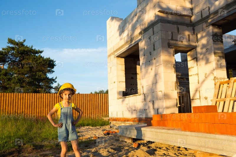 Маленькая девочка в желтой каске играет в строителя на стройке своего будущего дома. Мечты о переезде, выборе профессии, детском образовании