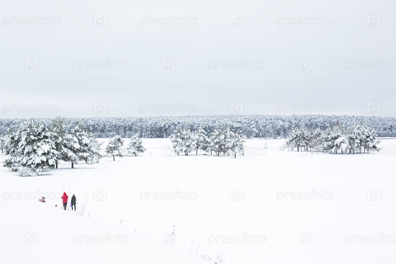 Заснеженные деревья в лесу после снегопада. Ель и сосна на белом, естественном фоне