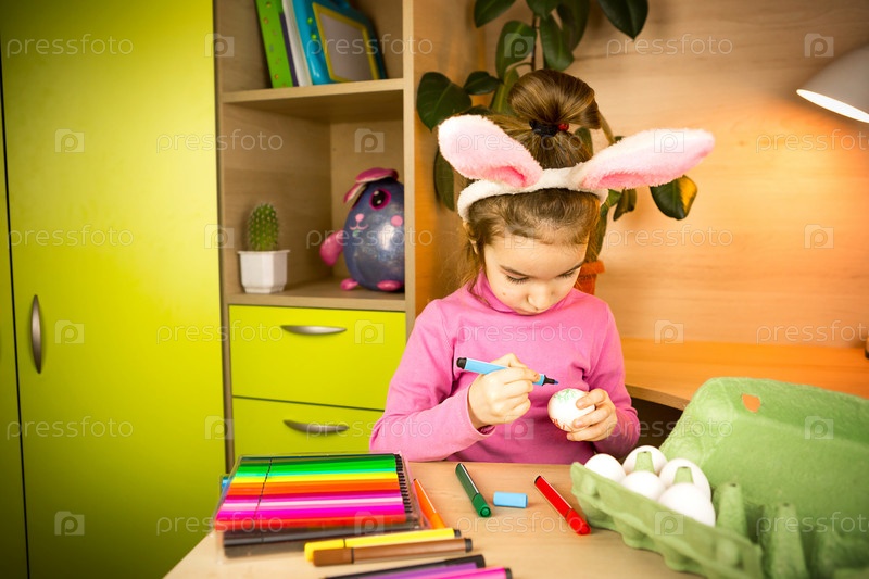 Девушка в ушах пасхального кролика красит яйца фломастером в домашнем интерьере. Поделки, подготовка к религиозному празднику, поднос с яйцами, заячьи ушки из пластилина