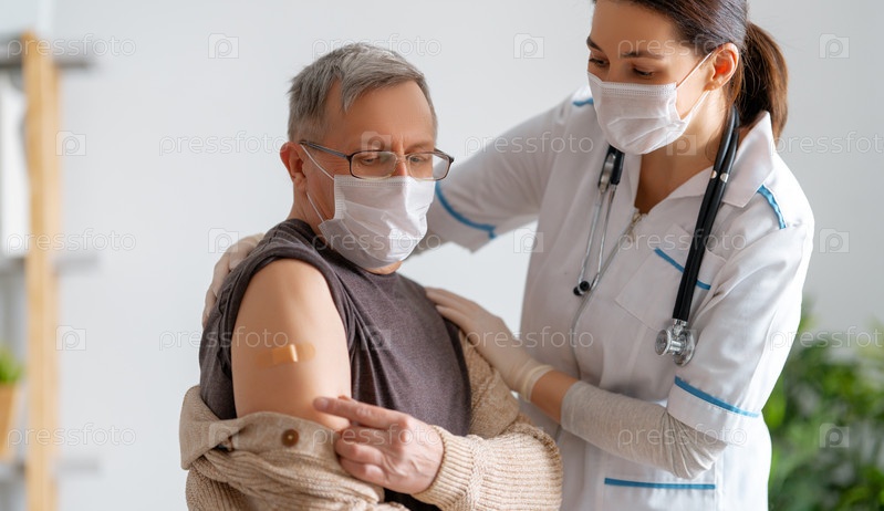 Пожилой седой мужчина после прививки разговаривает с врачом