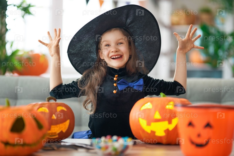 Маленькая смеющаяся девочка в костюме ведьмы