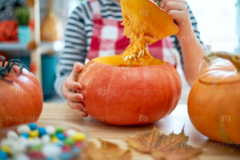Женщина вырезает тыкву