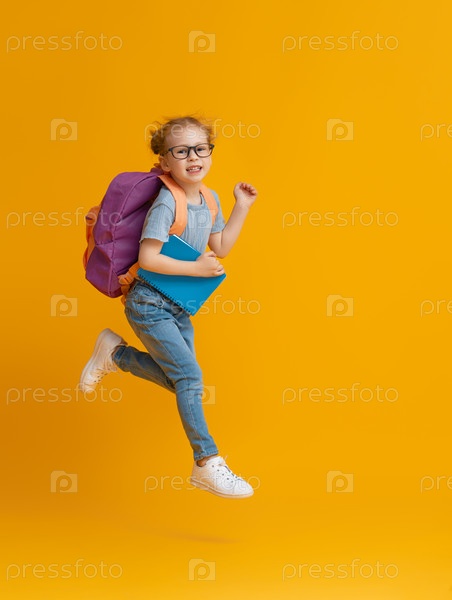 Малыш с рюкзаком на цветном фоне