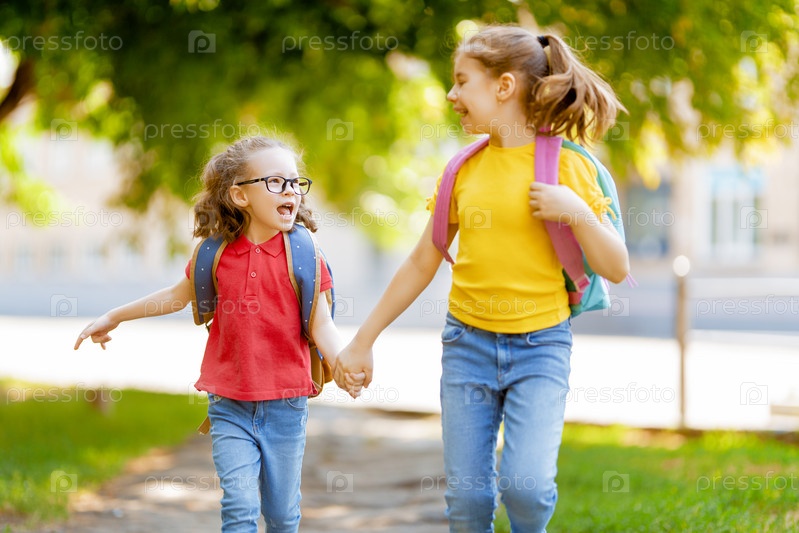 Девочки с рюкзаком идут в школу