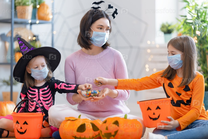 Семья празднует Хэллоуин в масках