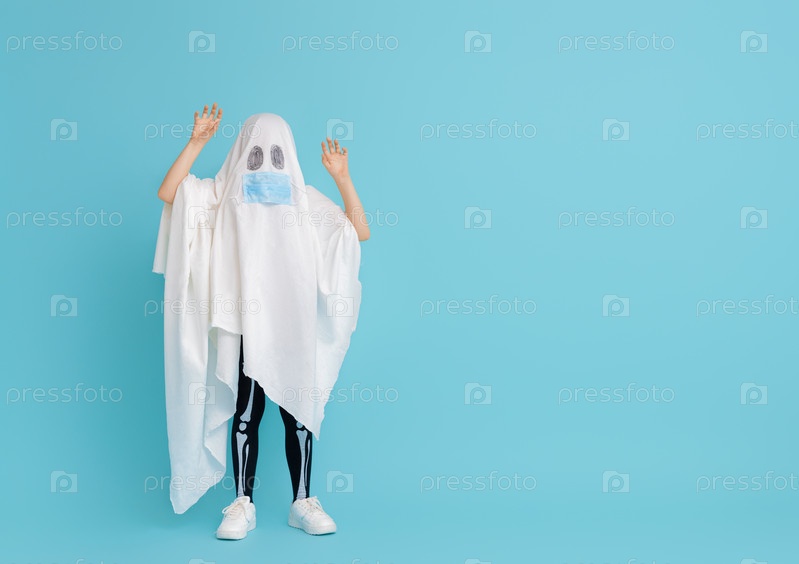 Ребенок в костюме призрака с маской на лице