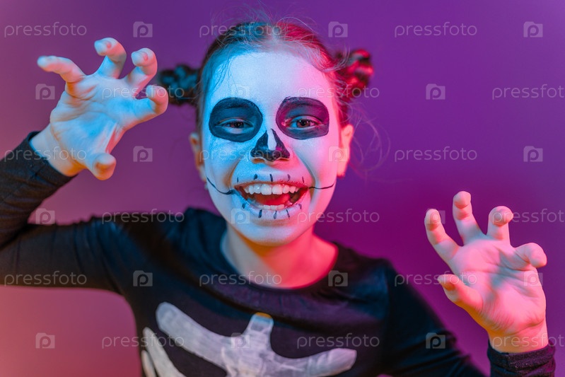 Ребенок на вечеринке при ярком освещении в костюме скелета