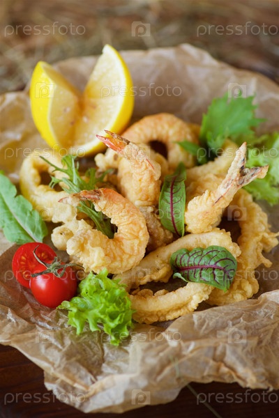 Креветки, кольца кальмаров и другие морепродукты, обжаренные во фритюре в кляре