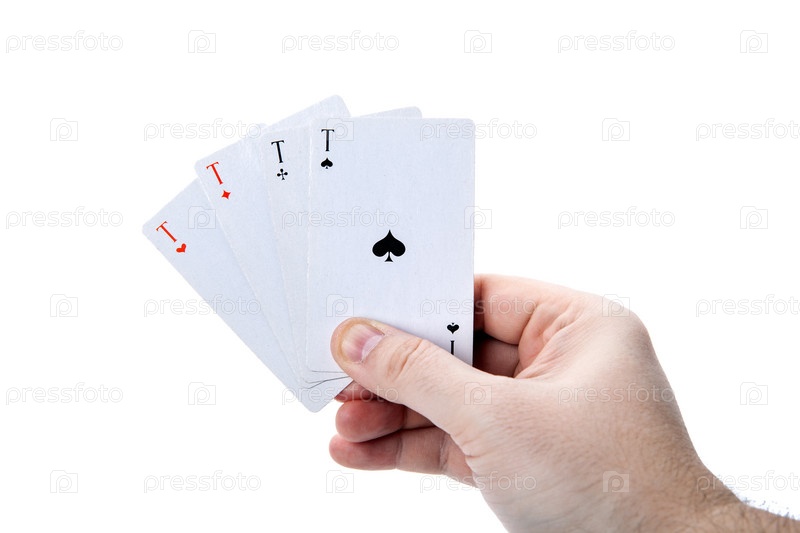 Четыре туза в мужской руке на белом фоне