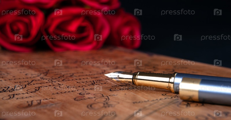 Перьевая ручка на письме с текстом и красными розами