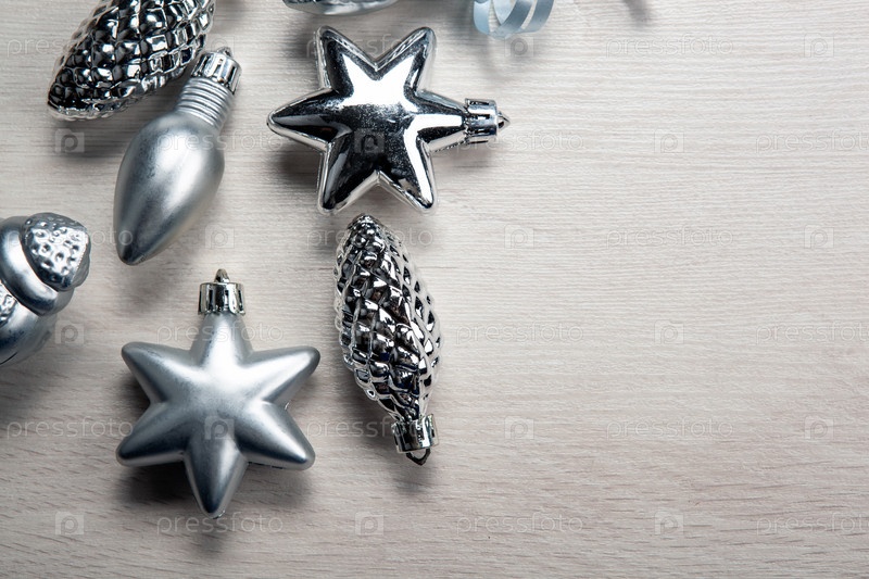 Серебряные рождественские стеклянные игрушки на сером фоне