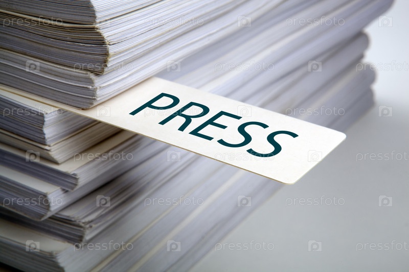 Закладка с надписью пресса в стопке документов концепции
