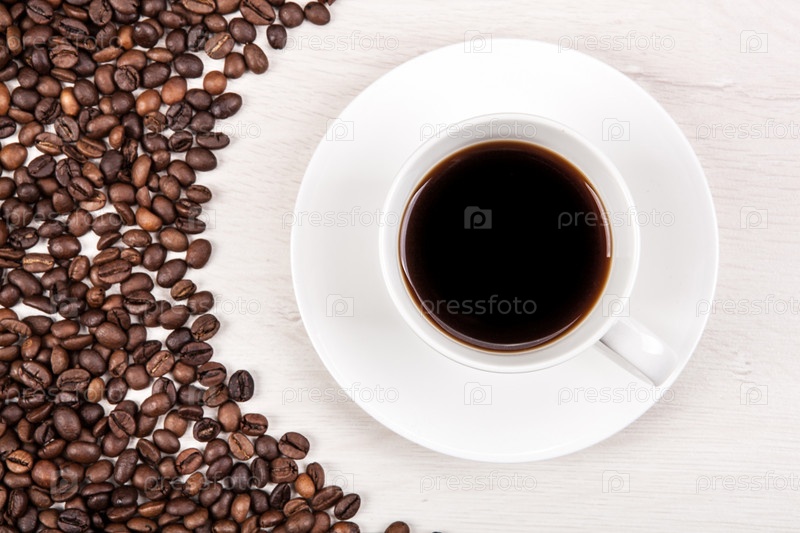 Чашка кофе на сером деревянном фоне и жареный кофе в зернах