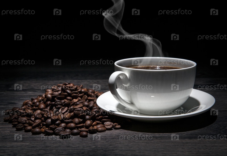 Чашка горячего кофе и жареные кофейные зерна на деревянном столе на черном фоне