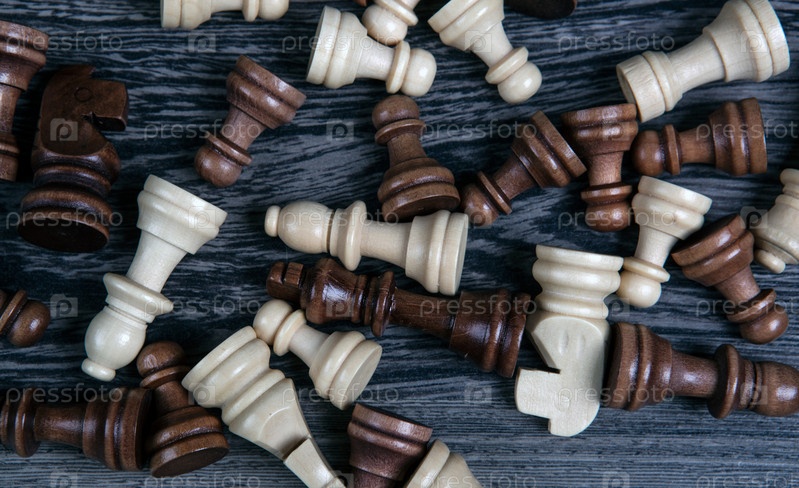 Разбросанные шахматные фигуры на деревянном фоне вид сверху