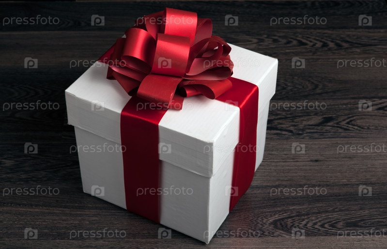 Белая коробка с красным бантом на деревянном столе на черном фоне