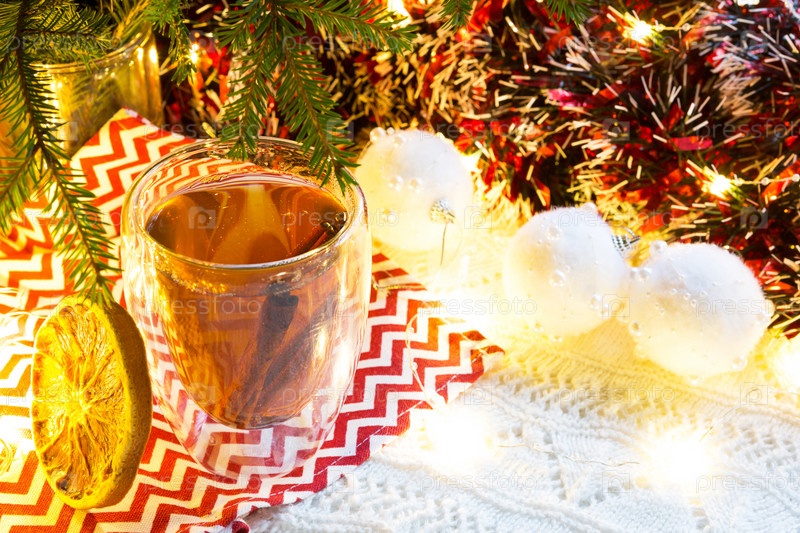 Прозрачный стеклянный стакан с двойными стенками с горячим чаем и палочками корицы на столе с рождественским декором. Новогодняя атмосфера, ломтик сушеного апельсина, гирлянда и мишура, еловая ветка, уютно