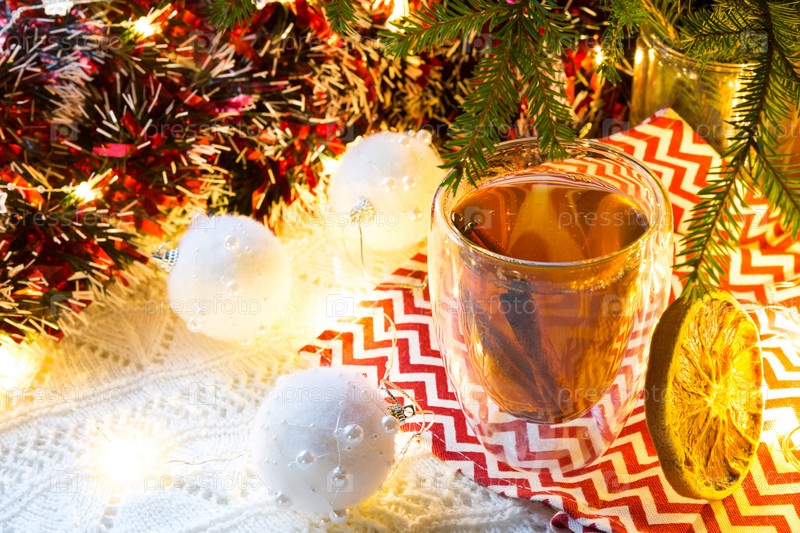 Прозрачный стеклянный стакан с двойными стенками с горячим чаем и палочками корицы на столе с рождественским декором. Новогодняя атмосфера, ломтик сушеного апельсина, гирлянда и мишура, еловая ветка, уютно