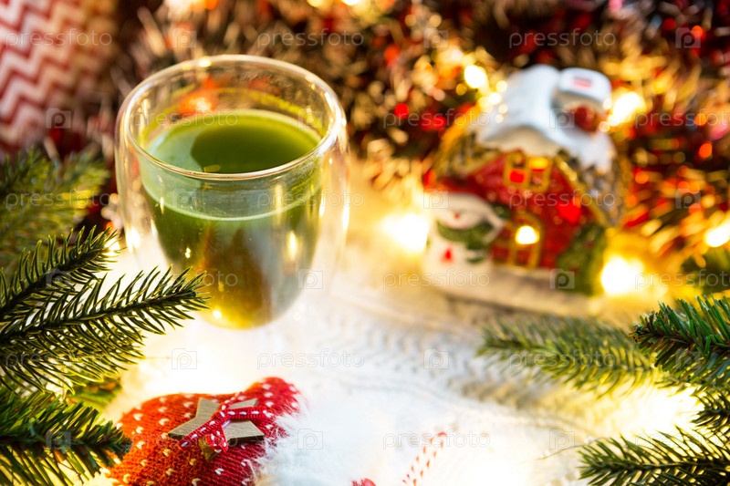 Прозрачный стеклянный стакан с двойными стенками и японским чаем маття на столе с рождественским декором. Новогодняя атмосфера, гирлянда и мишура, еловая ветка, уют, вязаный плед, шар, полосатая салфетка
