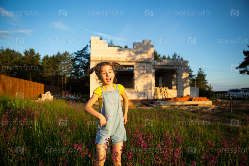 Маленькая девочка играет и танцует возле строительной площадки своего будущего дома в сельской местности. Ждут переезда, мечтают о будущем жилье. Ипотека, кредит на строительство