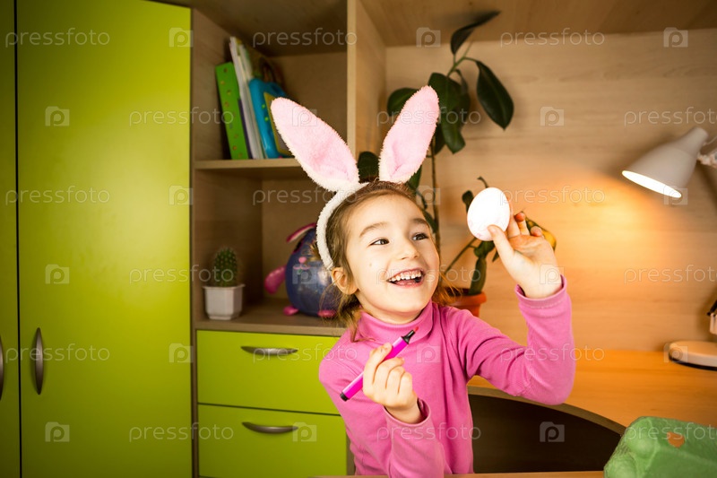 Девушка в ушах пасхального кролика красит яйца фломастером в домашнем интерьере. Поделки, подготовка к религиозному празднику, поднос с яйцами, заячьи ушки