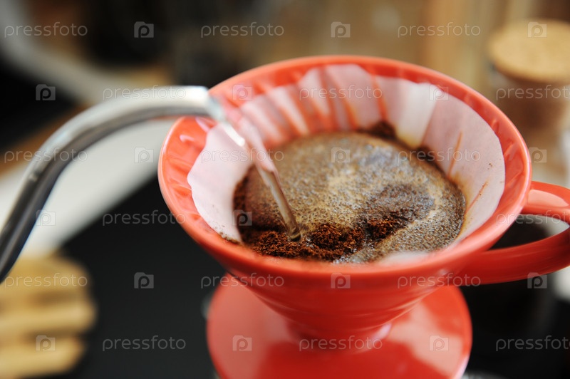 Процесс заваривания кофе. Красная керамическая капельница крупным планом. Цветущий