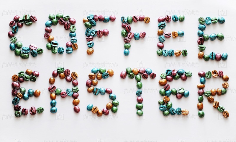Кофейная Пасха. Надпись из разноцветных жемчужных кофейных зерен на белом фоне