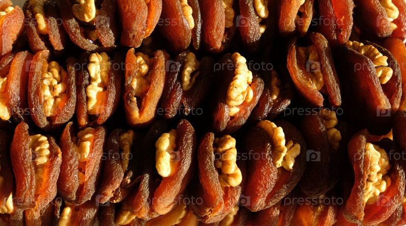 Курага фаршированная грецкими орехами. Восточные натуральные сладости. Горизонтальный фон