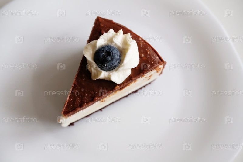 Кусок торта голубиного молока на белой тарелке. Шоколад, черника, сливочный гарнир