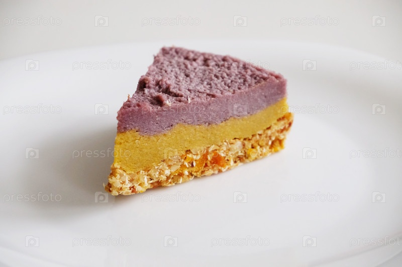 Сырой веганский черничный чизкейк на белой тарелке. Здоровый десерт