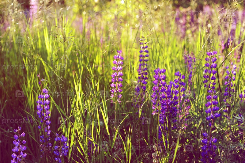 Дикое сине-фиолетовое поле люпинов на закате. Высокий травяной луг, сияющий солнечными лучами. Летняя эстетика