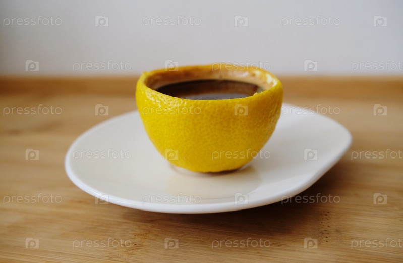 Креативная подача кофе эспрессо романо в чашке из свежего лимона. Необычная идея рецепта