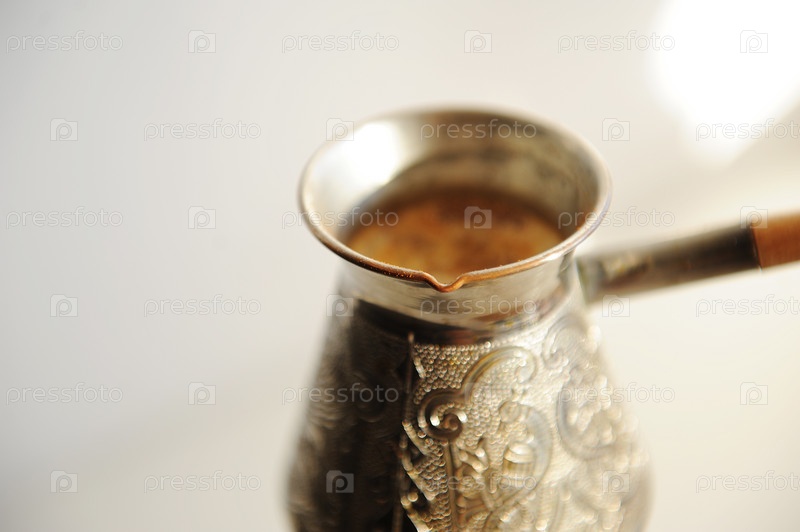 Кофе в турке варится на газовой горелке. белый фон