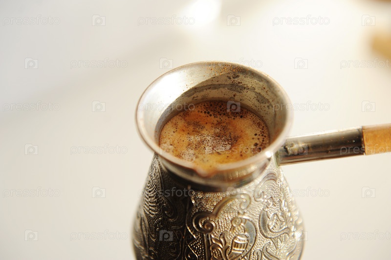Кофе в турке варится на газовой горелке. белый фон