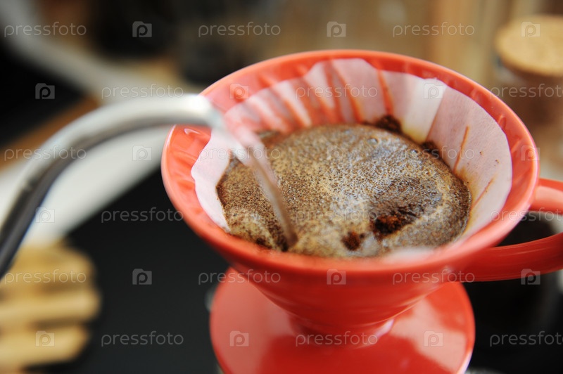 Процесс заваривания кофе. Красная керамическая капельница крупным планом