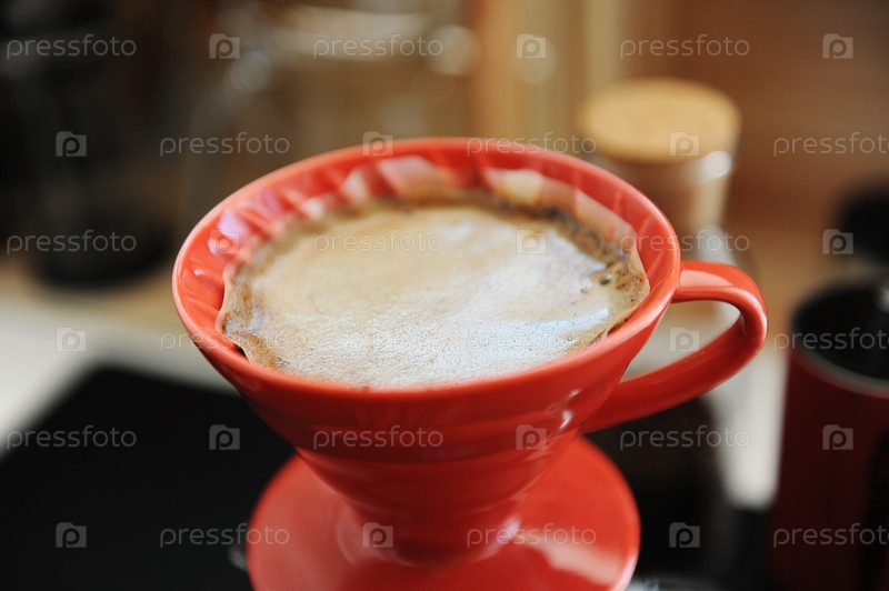 Процесс заваривания кофе. Красная керамическая капельница крупным планом