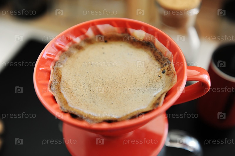 Процесс заваривания кофе. Красная керамическая капельница крупным планом