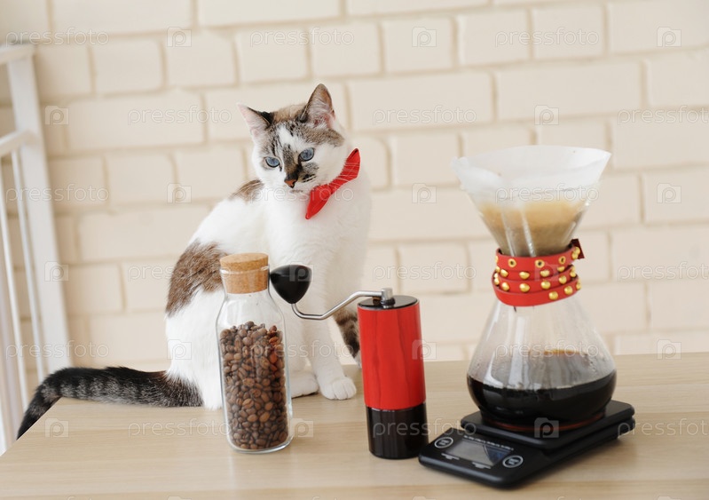 Кот бариста. Альтернатива ручному завариванию кофе. Капельный порционный фильтр. Красная кофемолка. Электронные весы