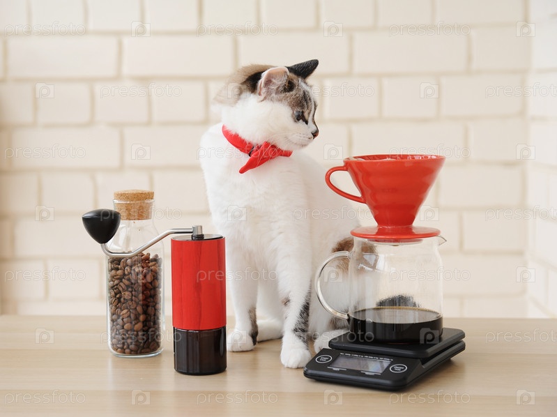 Кот бариста. Альтернатива ручному завариванию кофе. Капельный порционный фильтр. Красная кофемолка. Электронные весы