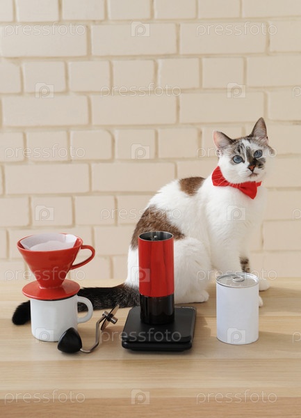 Ручная варка кофе. Насыпать, измельчить, масштабировать. Кот-бариста в красной бабочке. Альтернативный капельный фильтр периодического действия