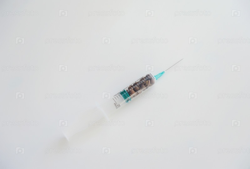 Кофейные зерна в медицинском шприце. Символ зависимости от кофеина