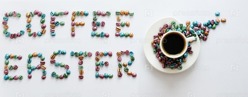 Кофейная Пасха. Надпись из разноцветных жемчужных кофейных зерен на белом фоне. Чашка кофе, разбросанные бобы