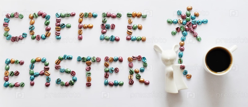 Кофейная Пасха. Надпись из разноцветных жемчужных кофейных зерен на белом фоне. Чашка кофе, белый кролик